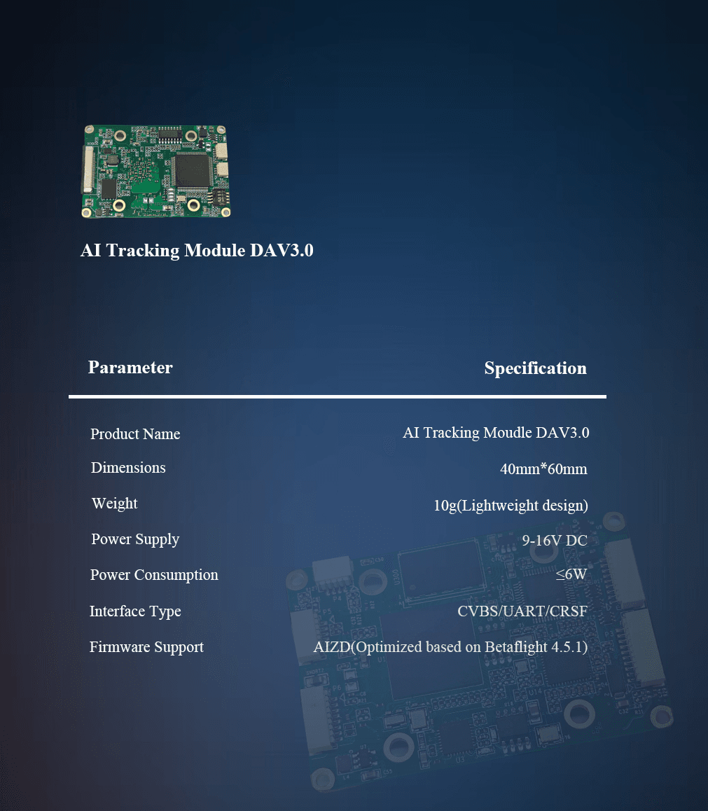 The AI Tracking Module DAV3.0 is a cutting-edge Drone AI Autopilot system designed for high-precision target recognition and autonomous tracking. By integrating advanced sensors and image processing techniques, it enables UAVs to lock onto and follow both stationary and moving targets. This module is engineered to simplify flight operations and overcome tracking challenges in complex environments with high signal interference, ensuring maximum mission efficiency.
