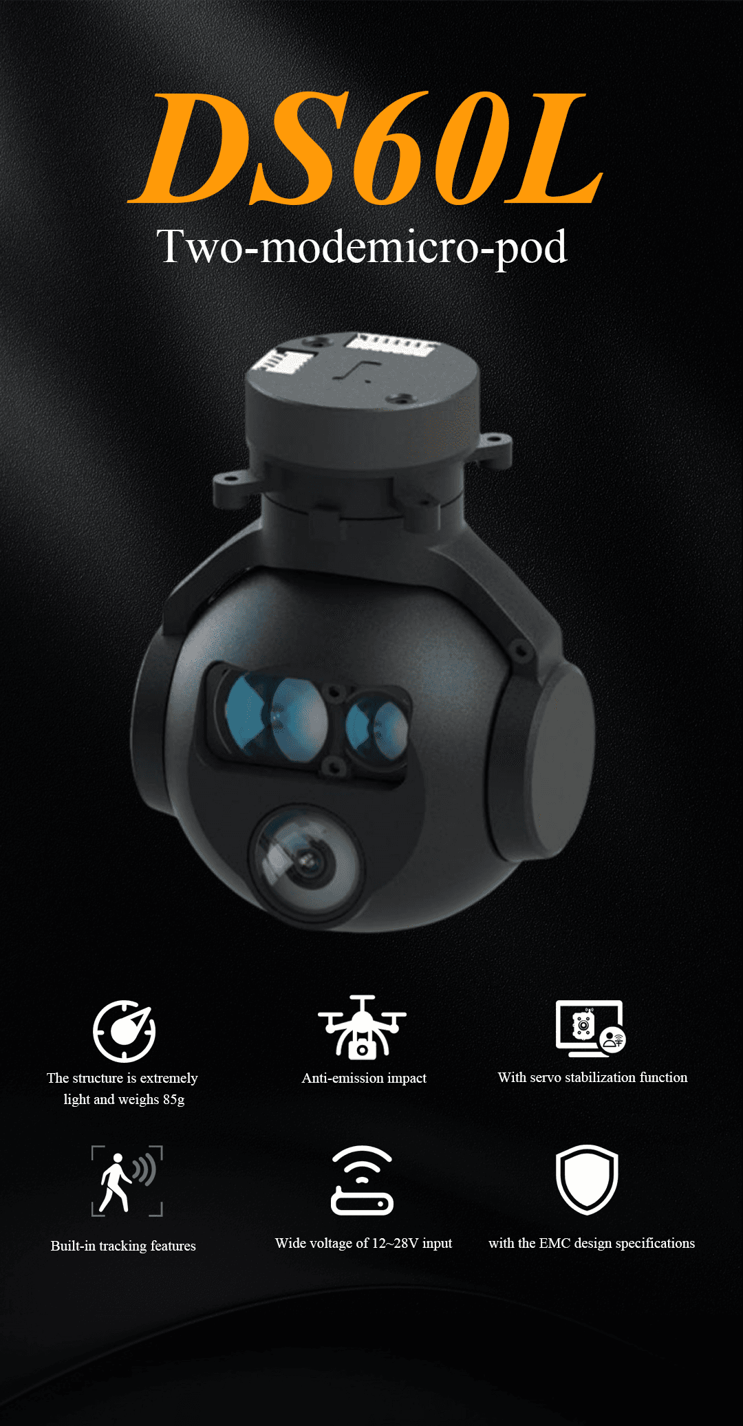 The DS60L Lynx-H is an ultra-lightweight dual-mode electro-optical gimbal that integrates visible light, infrared thermal imaging, laser ranging, and two-axis stabilization. Weighing only 85g and supporting a wide voltage input of 12~28V, it features exceptional launch impact resistance (≥400g) and meets EMC design specifications. Ideal for UAV mounting, handheld observation, and vehicle-based reconnaissance, it delivers stable, high-clarity imagery along with precise target tracking and ranging even in complex environments.