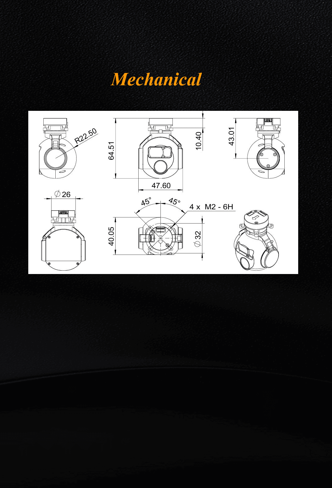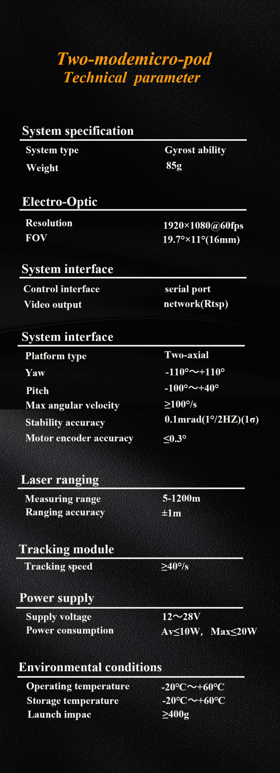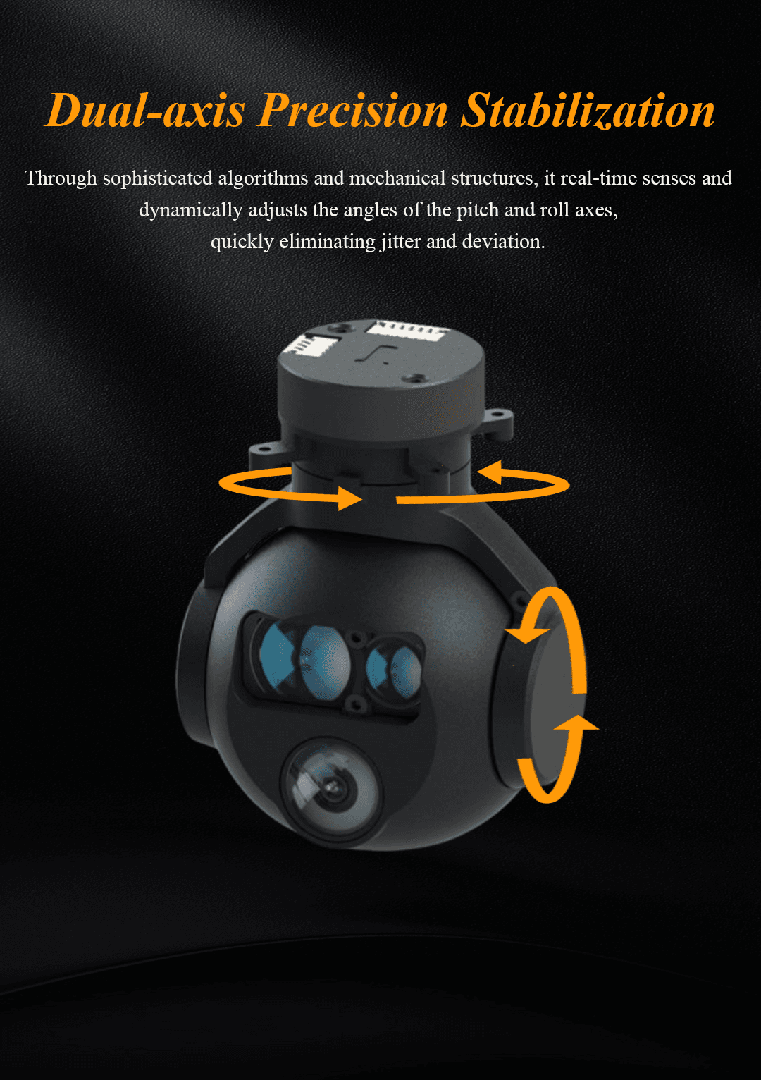 • Dual‑axis Precision Stabilization: Real‑time attitude sensing and servo control dynamically adjust pitch and roll axes, eliminating jitter with a stabilization accuracy of 0.1 mrad.
