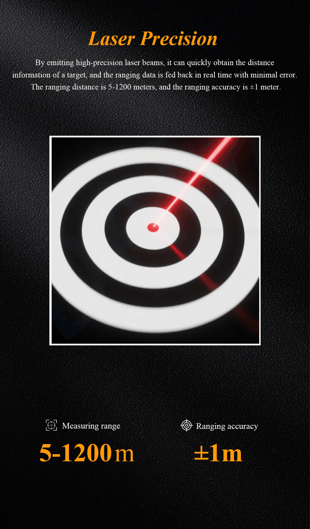 • High‑precision Laser Ranging: Measures distances from 5 to 1200 meters with ±1m accuracy, providing real‑time range feedback for precise targeting.