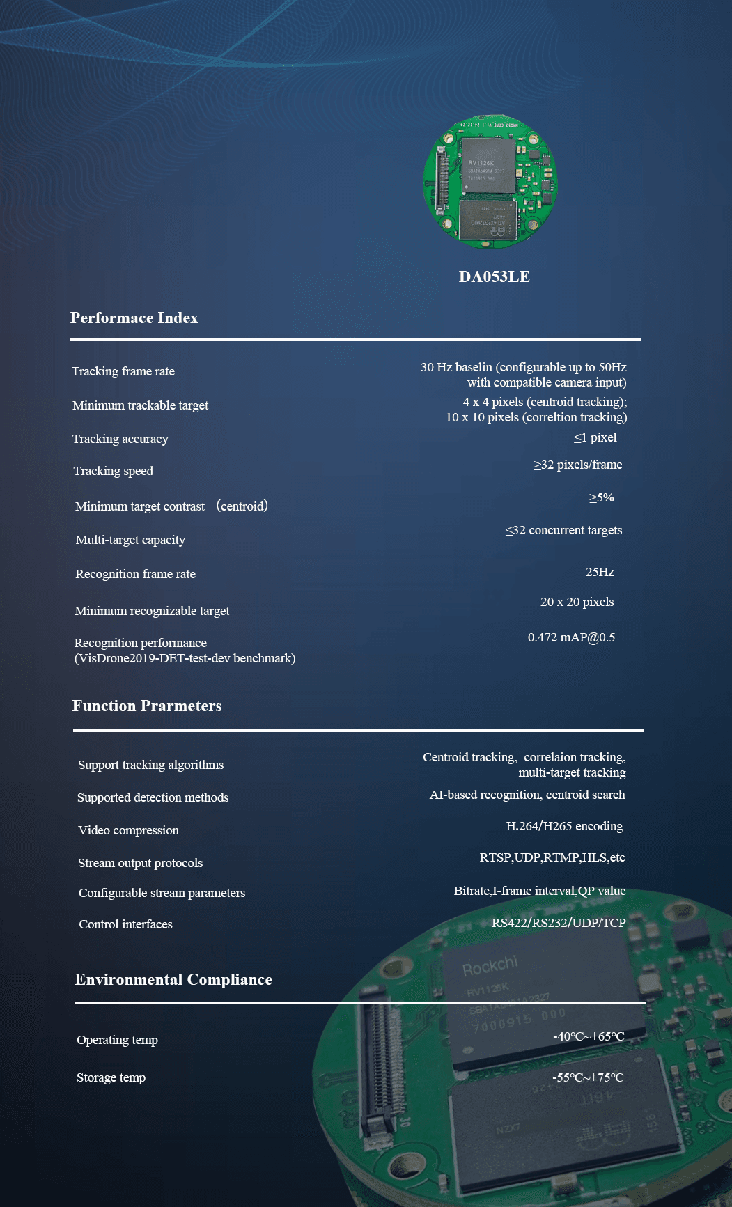 The Trac-DA053LE is a lightweight and miniaturized board designed for embedded AI video tracking applications,